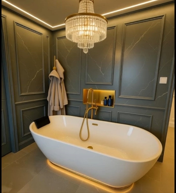 Above the bath, the statement chandelier adds a layer of glamour and softness. Lighting is always a key element in my designs, and in this space it enhances the textures, highlights the detailing, and creates a beautiful ambient glow.